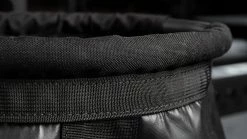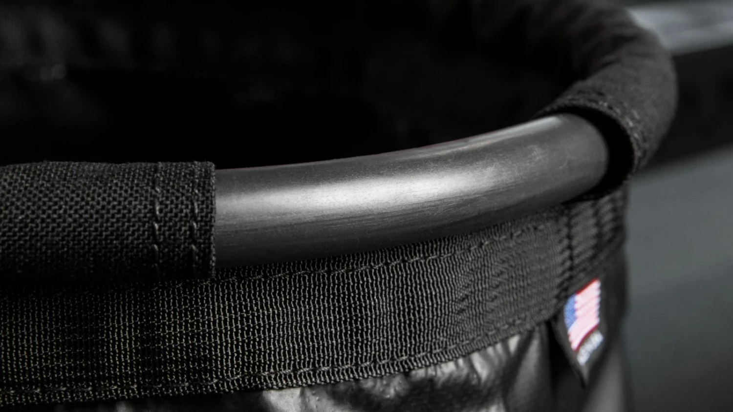 The Rogue Chalk Bag is Made in the USA from 18 oz. coated vinyl, with medium-weight nylon webbing along the rim and trim. A wide open-top design enables easy access, and the ring tubing includes a 600×300 PVC polyester fabric sleeve–serving as a dust-wicking guard to keep the chalk in the bag and off your flooring.
