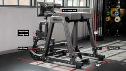 Built in the USA with 3×3” 11-gauge steel base tubing, the bolt-together Rogue Donkey’s first innovation can be seen in its diamond-tread GHD footplate, which features built-in side handles for doing reverse hypers. Using the convenient swing-arm adjustment system, athletes can easily shift the position of the footplate/handles forward or backward at any of 10 different settings (simply by pulling a pop pin), with 3 additional options for vertical height adjustments. Customizations can also be made in weight load, as the hyper posts each feature a loadable length of 10.5″.